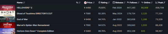 据SteamDB数据显示,在PlayStation登陆PC平台的所有游戏中,《绝地潜兵2》以458709人位列在线人数最高,但作为一款多人游戏,它的数据并不适用于单人作品的对比。在单人游戏方面,原纪录保持者是《对马岛之魂:导演剪辑版》,其最高在线人数为77154人。